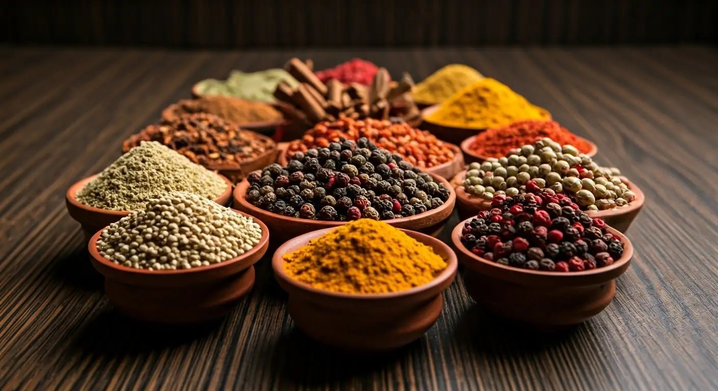 Turmeric (Lakadong Variety – High Curcumin), Red Chilli (Guntur, Teja, Byadgi), Black Pepper, Cardamom, and Cumin.